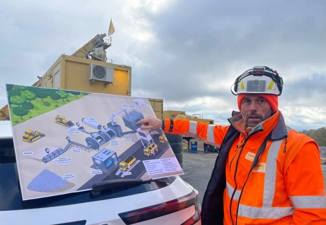 « Les granulats arrivent un peu humides dans un tube malaxeur. On les monte à une certaine température pour qu’ils réchauffent les agrégats d’enrobés qui entrent en milieu de cycle. En fin de cycle, on incorpore les poussières générées par le processus de fabrication et le bitume qui va enrober chaque petit caillou et agir comme une colle pour qu’ils restent bien collés entre eux et que l’on puisse rouler dessus. L’enrobé monte dans une trémie de stockage et il est ensuite prêt à partir sur le terrain, à une température de 150 à 180°, vers les ateliers d’application », explique François Baudonnet, directeur de travaux chaussée.
